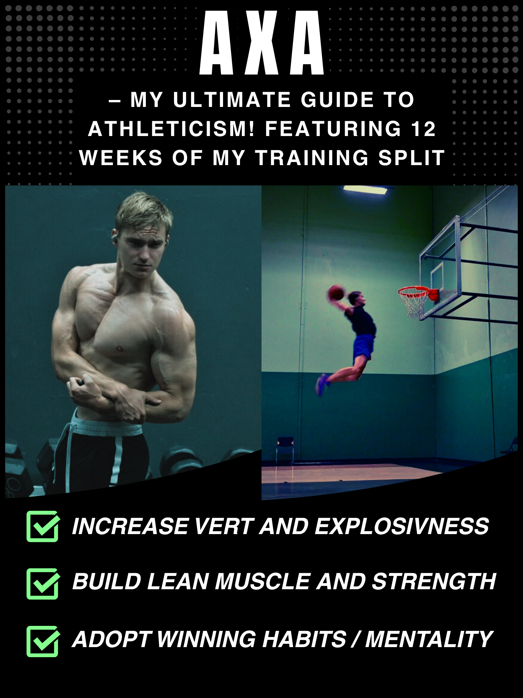 My 3 month training guide designed for you to achieve your athletic and physical goals. Learn & apply my systems and training split which has allowed me to gain 24β+ of vertical jump and 60+ lbs of lean muscle! (Completely naturally)